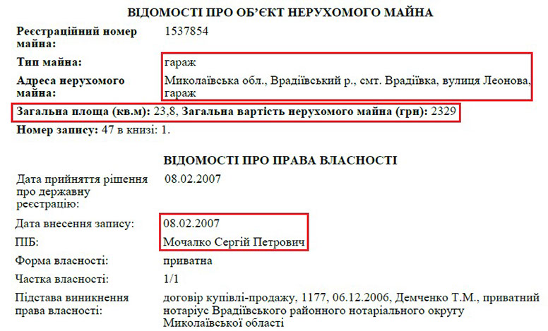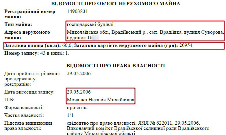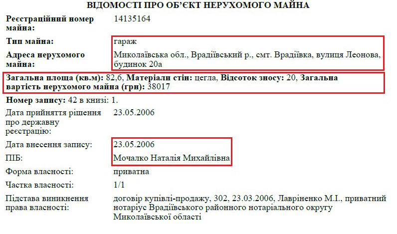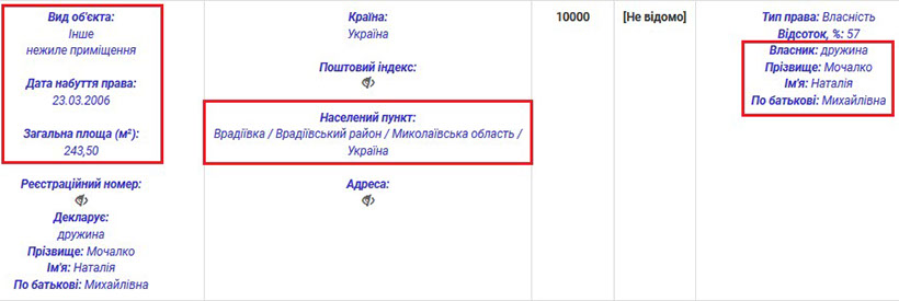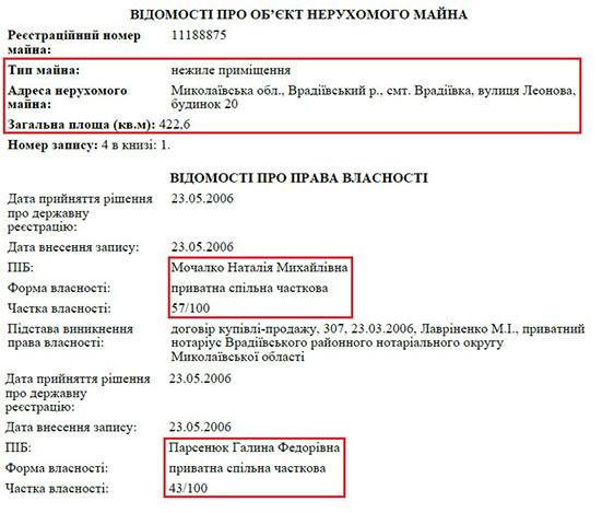 У декларації прокурора також вказано, що його дружина є власником частини нежитлового приміщення, площею 243 кв. м. Іншим власником цієї будови є Галина Федорівна Парсенюк, яка швидше за все є дружиною екс-начальника УМВС України в Миколаївській області Валентина Миколайовича Парсенюка. У реєстрі речових прав на нерухоме майно згадують господарські приміщення, які також належали Наталії Михайлівні. Втім, чи досі вона є їхнім власником – невідомо.