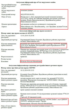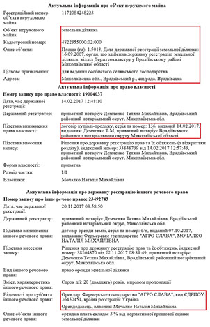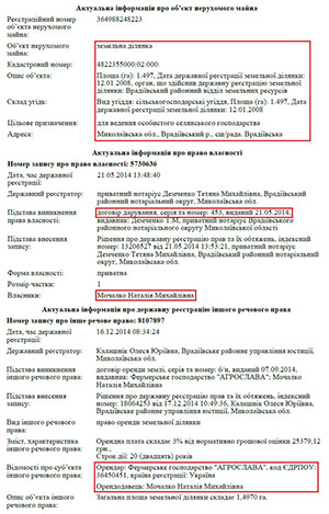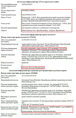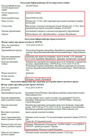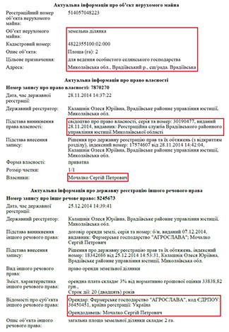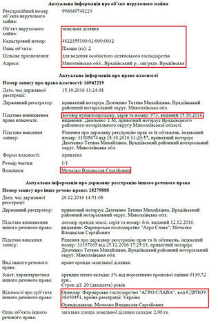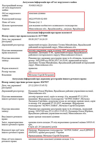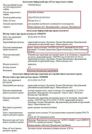 Не менше майна і в інших родичів прокурора Сергія Мочалка. Наприклад, їхній 21-річний син Владислав Сергійович Мочалко теж обзавівся землею. У його власності 2 земельні ділянки, площею 4 га. Їх він теж здає в оренду фермерському господарству «АГРО СЛАВА».