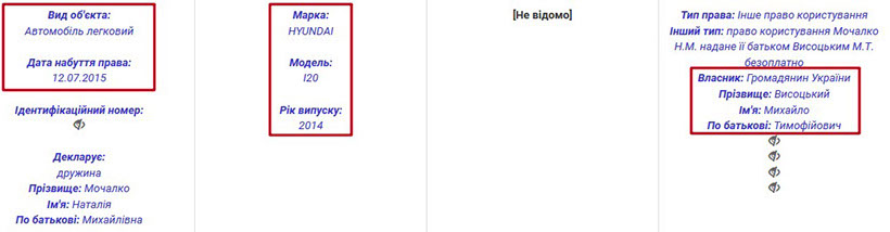 Батько дружини прокурора – Михайло Тимофійович Висоцький, який теж є депутатом Врадіївської селищної ради, задекларував 3 земельні ділянки площею 6 га, 2 будинки та 1 квартиру в Миколаєві. Серед авто у власності екс-судді є Renault Duster 2013 року (придбав у 2014 році), вище згаданий Hyndai I20 YNDAI I20 2014 року випуску та Daewoo Lanos 2005 року.