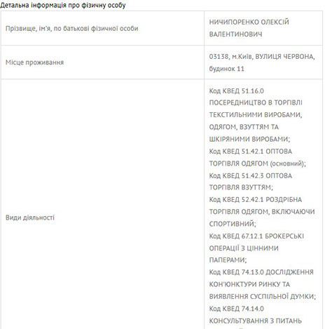 Нас також зацікавив і інший факт. Олексій Валентинович Ничипоренко із 2004 року теж займався бізнесом і був зареєстрований фізичною особою-підприємцем. Прокурор займався оптовою торгівлею одягу. І займався він цим аж до 2015 року. Натомість Генеральна прокуратура повідомляла, що Олексій Валентинович із 2009 року «працював безперервно в органах прокуратури на посадах...». Виходить, що прокурор поєднував свою правоохоронну діяльність із підприємництвом, що теж суперечить чинному законодавству.