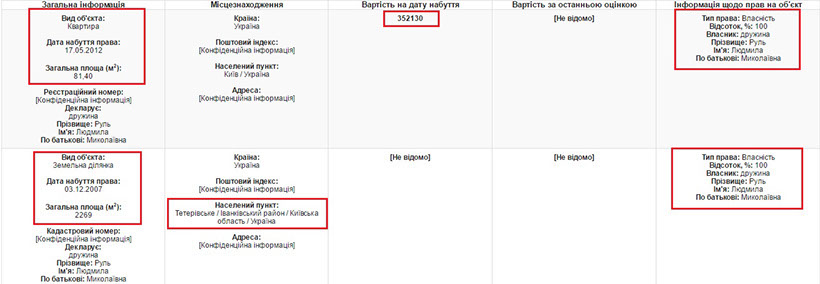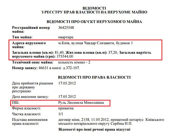 Згідно з декларацією, володіє дружина судді квартирою в Києві площею 81 кв.м. та земельною ділянкою в Київській області площею 2269 кв.м. Ще дві квартири в столиці площею 77,07 кв. м. та 77,65 кв. м. наразі будуються. Цікаво, що власником цих недобудов є Генеральна прокуратура.