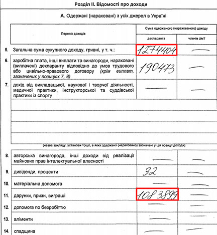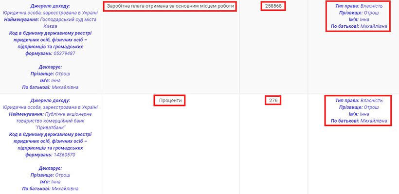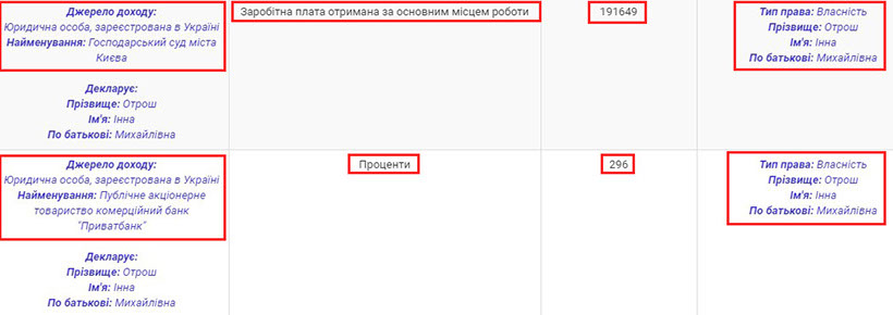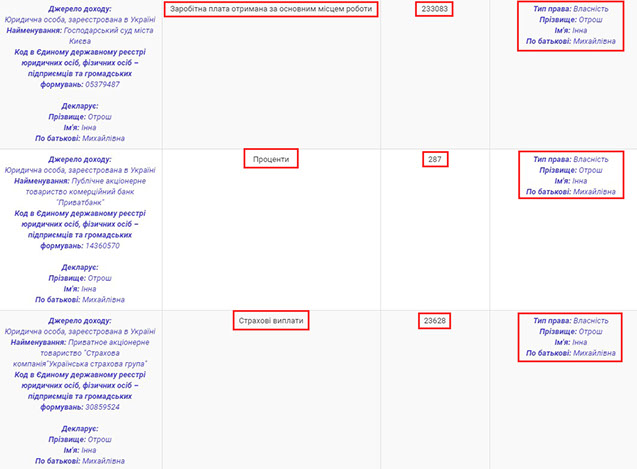 Ми також проаналізували декларації судді за 2013, 2014, 2015, 2016 та 2017 роки. За цей період Інна Отрош мала переважно суддівську заробітну плату. У 2014 році отримала подарунок – 1 083 899 грн, але це очевидно вартість отриманої у дар квартири. Загалом за вказаний період Інна Михайлівна заробила трохи більше двох мільйонів гривень.