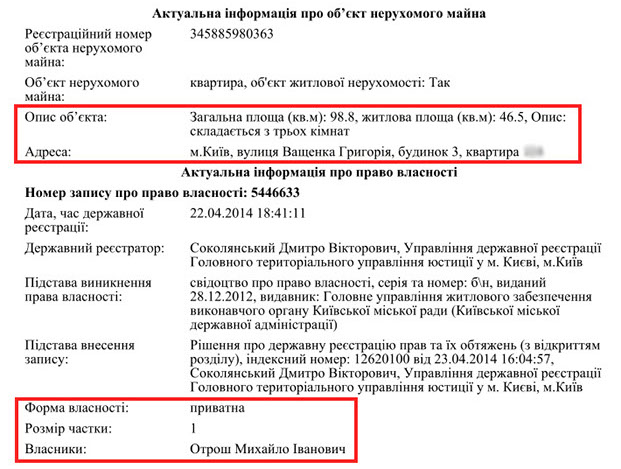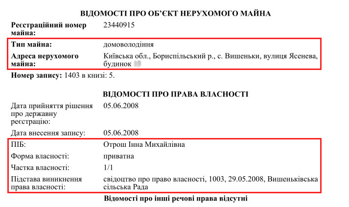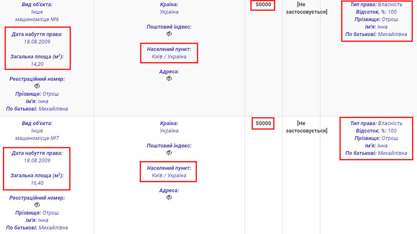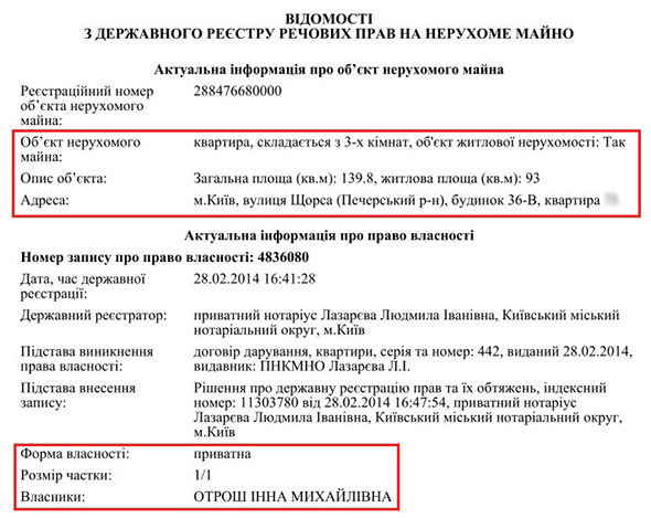 Вже через рік на пані Отрош переписують ще два об’єкти: квартиру на 96 та 146 кв. м. Переписали, бо, будучи студенткою Луганського вишу, майже неможливо самостійно купити дві квартири ще й в Києві. Особливо коли багато коштів пішло на будівництво котеджу.