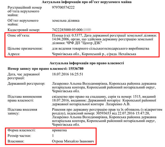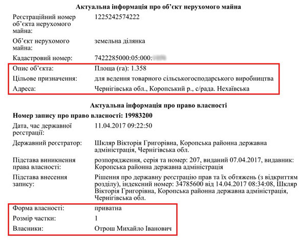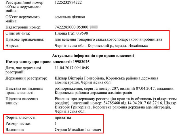 Ми ж поки звернулися до нерухомості батька – Отроша Михайла Івановича. Виявилось, що чоловік має чотири великі земельні ділянки у Чернігівській області з призначенням для ведення товарного сільського виробництва. Крім того, у 2014 році він приватизував квартиру на 98 кв. м.