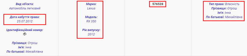 Щодо автопарку, то Інна Михайлівна Отрош з 2012 року має у власності лише один транспортний засіб: Lexus RX 350, придбаний за 576 528 грн. Але водночас вона володіє двома паркомісцями, для чого ще одне – незрозуміло.