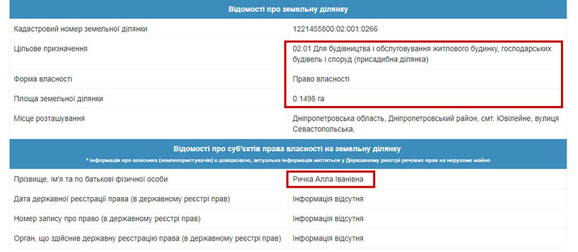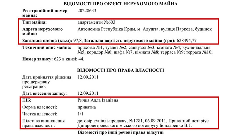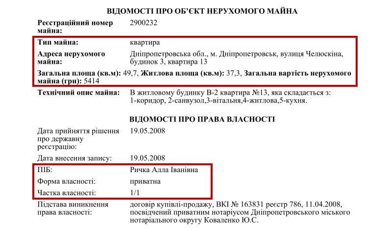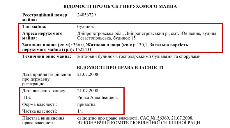 Втім ці квартири не останнє коштовне майно, записане на Аллу Ричку, матір судді та дружину екс-прокурора. У реєстрі міститься інформація про житловий будинок на 336 кв. м. під Дніпром.