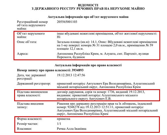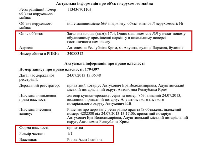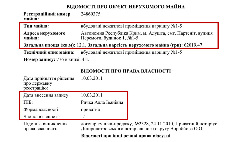 По-перше, вона володіє апартаментами в Алушті, нежитловим приміщенням у Криму набутим на підставі договору дарування, та паркінгами.