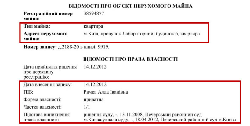 З тексту рішень випливає, що ще у 2005 році Алла Іванівна інвестувала у 4 квартири в новобудові понад 3,8 млн грн . Саме тоді Алла Ричка працювала у відділі освіти Амур-Нижньодніпровської районної ради міста Дніпропетровська (нині Дніпро). Навряд чи заробітної плати державного службовця їй вистачило б на придбання цих елітних квартир у столиці.