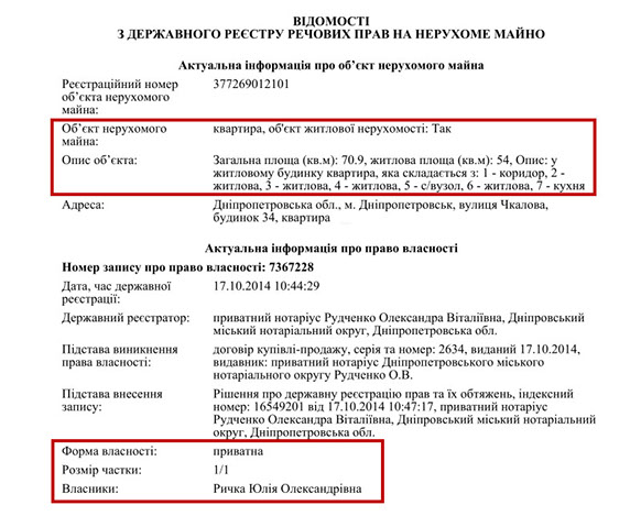 Але справжній сюрприз нас очікував, коли ми поцікавились – а кому ж належить ця нерухомість. Виявляється, наразі власником квартири, де знаходиться нотаріальна контора, є Жукова Ірина Володимирівна – теща судді. Проте найцікавішим є те, як і чому вона стала власником приміщення. Отже, його першим власником була мати судді – Ричка Алла Іванівна. Власність у неї виникла на підставі рішення Бабушкінського районного суду м. Дніпропетровська від 07.08.2014 року.
