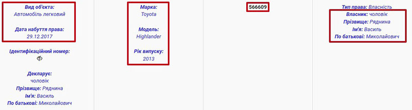 Чоловік Вікторії Ряднини задекларував автомобіль Toyota Highlander 2013 року випуску, який купив у 2017 за 566 тис. грн. Також він задекларував водний засіб та причіп.
