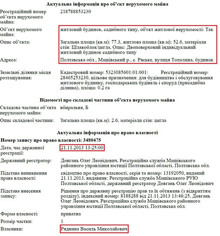 У декларації Вікторії Ряднини вказана квартира площею 80 кв. м. в Машівці. Власниками цього майна є також її чоловік та дочка – Ілона Василівна Ряднина.
