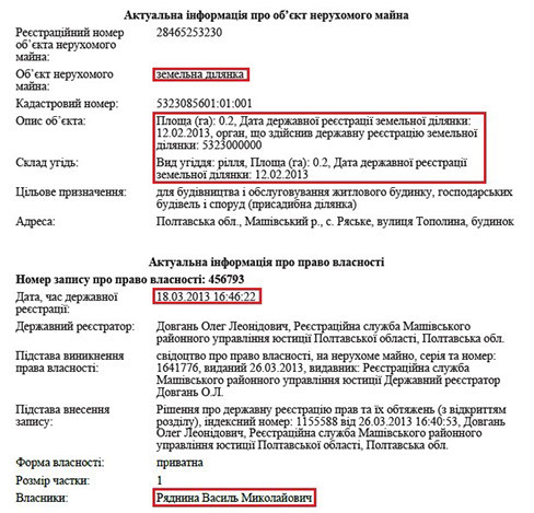 Власником ще однієї земельної ділянки є Василь Ряднина. Цю землю екс-суддя зареєстрував у 2015 році. Цікаво, що ще з 2014 року її орендує ТОВ «Компанія Фармко», кінцевим бенефеціарієм якої є Юрій Якович Лебедин – депутат Полтавської обласної ради. За здачу землі в оренду Василь Ряднина отримує в середньому 20 тис. грн на рік.