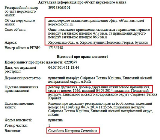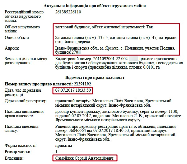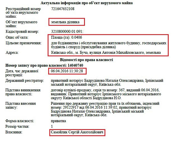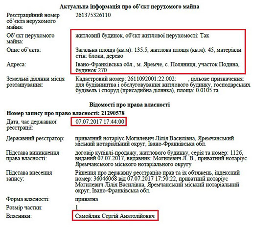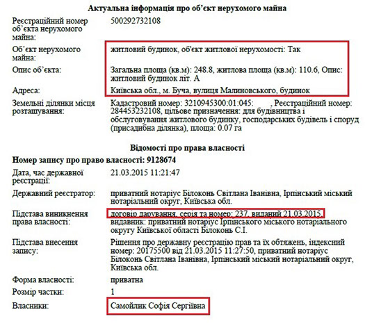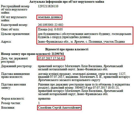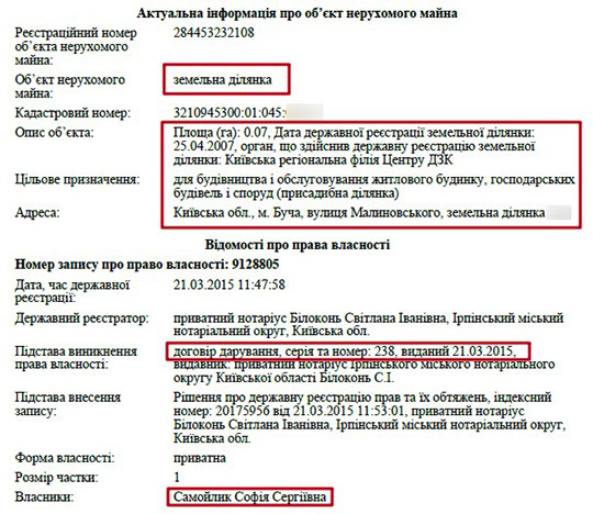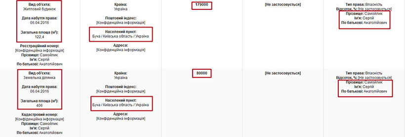 Також, що цікаво, декларація прокурора за 2013 рік майже пуста. Там немає ні земельних ділянок, ні квартир, ні будинків, а лише два автомобілі у родичів. Натомість з 2015 року матеріальне становище його родини значно покращується. Наприклад, неповнолітній дочці прокурора Софії Сергіївні Самойлик подарували будинок в Бучі та землю під ним. Загальна задекларована вартість цього майна – понад 1 млн грн.