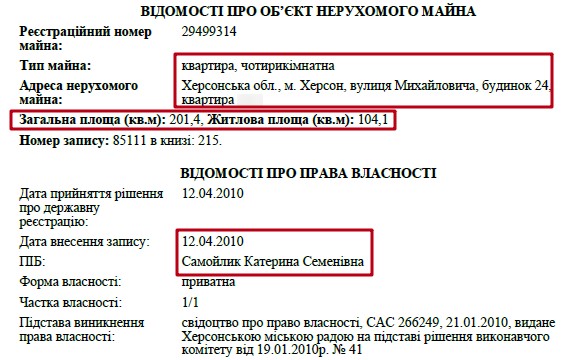 Матір прокурора, екс-народний депутат Катерина Самойлик, нині мешкає у Херсоні. Тут у її власності є відразу 3 квартири загальною площею 301 м² та офісне приміщення.