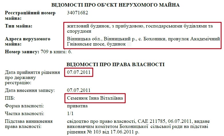 Зокрема, у власності дружини перебуває будинок на 354 м², що розташований в с. Бохоники за 14 км від Вінниці. Придбала Інна Віталіївна даний будинок у 2007 році. Пані Інні також належить і 12 соток землі під цим будинком. Сьогодні приблизна вартість такого маєтку – 220 тис. дол.