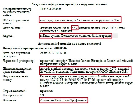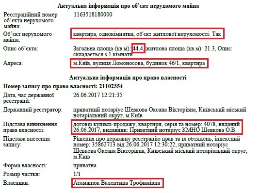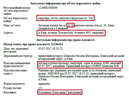 Ну і наостанок, тесть Олега Сенюка – 63-ох річний екс-заступник генпрокурора Олександр Атаманюк разом із своєю 62-ох річною дружиною Валентиною Трофимівною у 2017 році придбали три квартири за адресою м.Київ, вулиця Ломоносова 46/1. Усі три квартири загальною площею 131 м² у цьому будинку сьогодні коштують бл. 170 тис. дол.