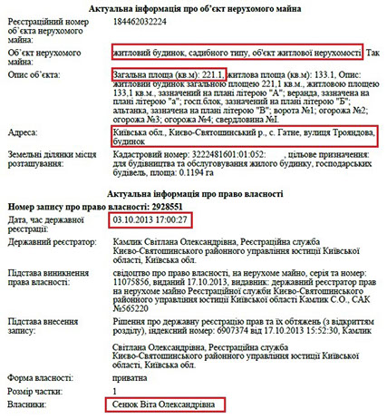 Віта Олександрівна Сенюк також володіє ділянкою площею 0,1 га біля Києва, на території Вороньківської сільради.