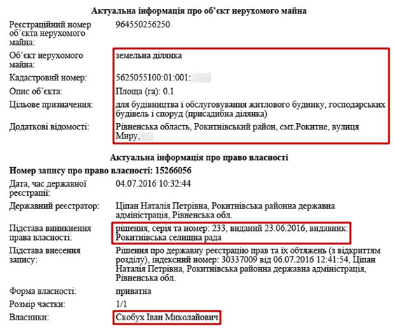 Та повернімося до нерухомості самого прокурора. З 2012 року Іван Скобух є власником земельної ділянки в с. Городище. Задекларована її площа – 900 кв. м. Однак знову ж таки в декларації за 2014 рік ділянки такої площі немає. Натомість є земля площею 907 кв. м, яку прокурор, вочевидь, отримав від Городищенської сільської ради. Сподіваємося, що контролюючі органи дослідять більш детально цей факт невідповідності. У 2016 році Іван Скобух також став власником земельної ділянки у смт. Рокитне.