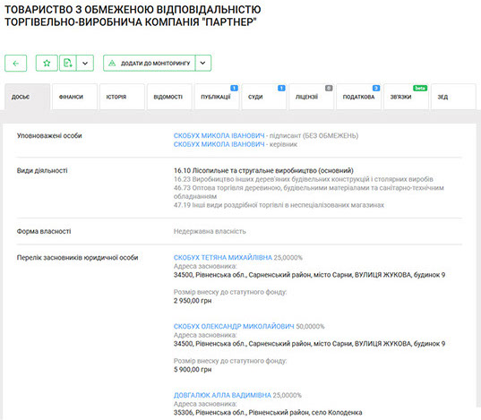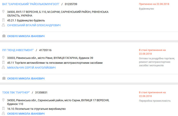 Частина майна прокурора перебуває у власності його батька – Миколи Івановича Скобуха. Завдяки аналітичній системі YouControl нам вдалося дізнатися, що Микола Іванович має стосунок до трьох компаній, усі вони вже припинили свою діяльність: ВАТ «САРНЕНСЬКИЙ «РАЙСІЛЬКОМУНГОСП», ПП «ЛЕНД ІНВЕСТМЕНТ» і ТЗОВ ТВК «ПАРТНЕР». В останній компанії співзасновниками також є матір прокурора Тетяна Михайлівна Скобух і його брат Олександр Миколайович Скобух.