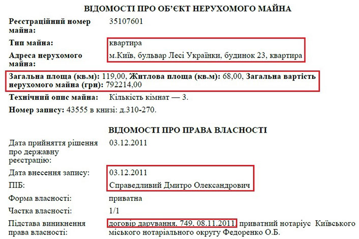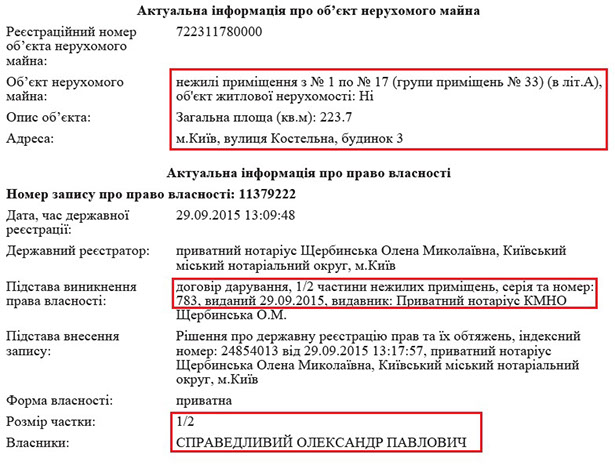 Цікава й історія, як ці нежитлові приміщення потрапили у власність родичів Дмитра Справедливого. У 2010 році приватне підприємство, співзасновником якого була Ольга Справедлива – «ДЕСНА АВ» відсудила ці приміщення у Головного управління комунальної власності м. Києва.