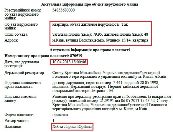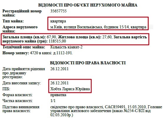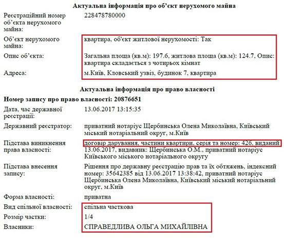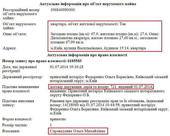 Ще одна квартира, власником якої є Ольга Справедлива, розташована за адресою: вул. Васильківська 15/14. Це житло пані Ольга отримала на підставі договору дарування від своєї матері.