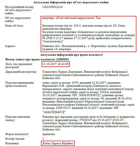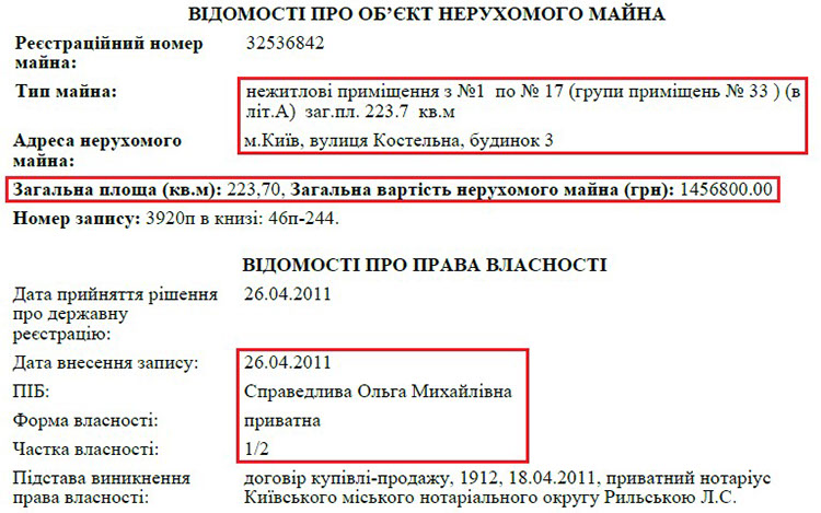 Ольга Михайлівна з 2011 року була власницею нежитлових приміщень за адресою: вул. Костельна, 3, що в самому центрі Києва. Площа цих приміщень – 223 кв. м. Але вже у 2015 році їхнім власником стає батько прокурора. Виходить, що станом на 2014 рік саме пані Ольга була власником даного майна, однак в декларації прокурора воно не вказане!