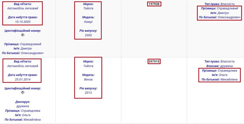 У декларації прокурора Дмитра Справедливого вказано два автомобілі: у 2005 році Дмитро Олександрович придбав Toyota Camry 2005 року випуску, а у 2014 році його дружина стала власницею Toyota Venza 2013 року.
