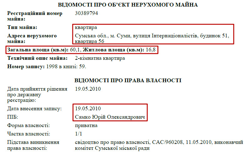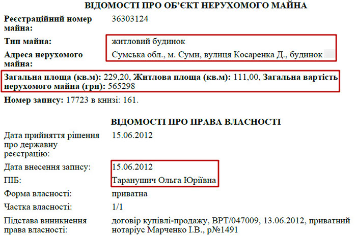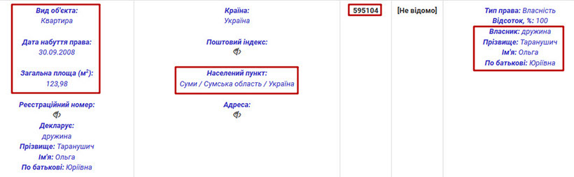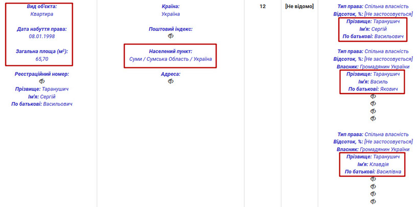 Також Сергій Васильович є власником ще однієї земельної ділянки у Сумах вартістю 146 тис. грн. На жаль, її розташування ми не змогли знайти через відсутність майна у реєстрі речових прав на нерухоме майно. Теж саме стосується і квартири в Сумах, власниками якої, окрім прокурора, є його батьки: Василь Якович Таранушич та Клавдія Василівна Таранушич.