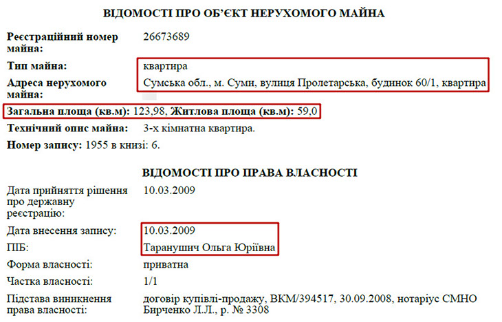 У власності Ольги Таранушич є квартира площею 123 кв. м. за адресою: вулиця Пролетарська (Ярослава Мудрого), будинок 60/1. У 2008 році це житло пані Ользі обійшлося у 595 тис. грн або 122 тис. у. о. за тодішнім курсом.