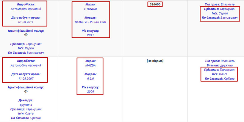 Серед автомобілів у власності Сергія Таранушича HYUNDAI Santa Fe 2.2 CRDi 4WD 2011 року. Його вартість на момент придбання у 2011 році становила 326 тис. грн. Пані Ольга є власницею MAZDA 6 2.0 2006 року.