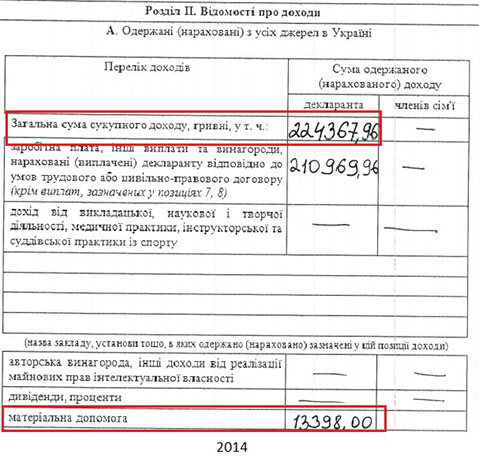 Проаналізувавши декларації Оксани Тищенко за 2013, 2014 та 2015 роки ми бачимо, що єдиними доходами судді є її заробітна плата та матеріальна допомога, яку вона регулярно отримує всі ці роки. При цьому суддя Тищенко є матір’ю-одиначкою і, враховуючи відсутність в декларації аліментів, забезпечує сина виключно за власний кошт.
