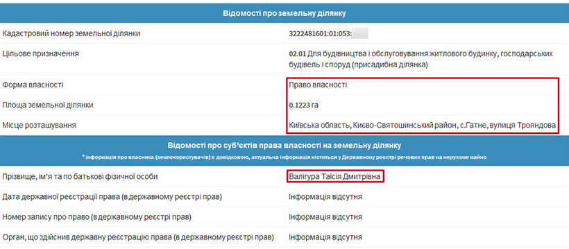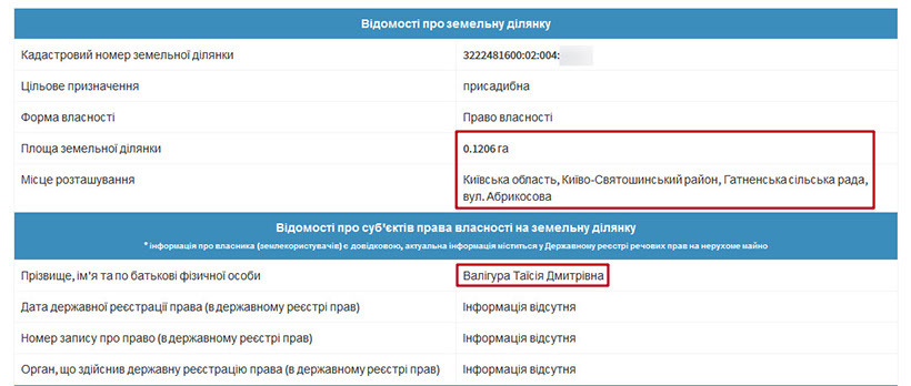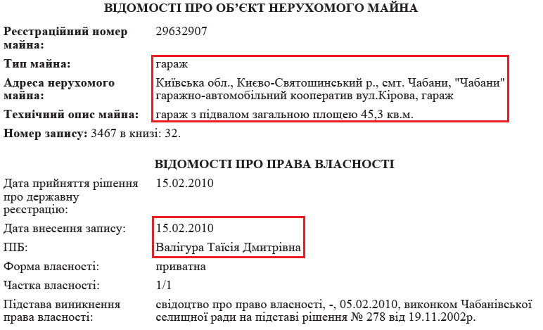 Окрім вищезгаданого будинку, матір судді є власником іншого майна. Таїсія Дмитрівна володіє гаражем у Чабанах. Його площа 45 кв. м. Також у власності Таїсії Валігури земельні ділянки в Чабанах та Гатному. До речі, на співбесіді суддя повідомив, що одну із земельних ділянок в Гатному його матір придбала за 270 тис. грн у 2006 році. Нагадаємо, все життя вона пропрацювала вчителем.