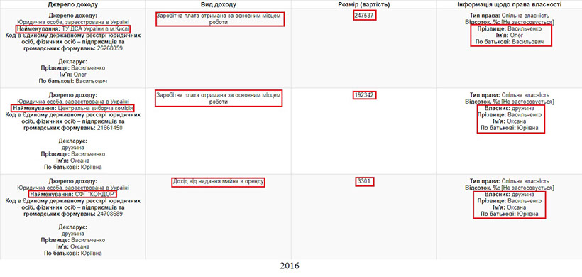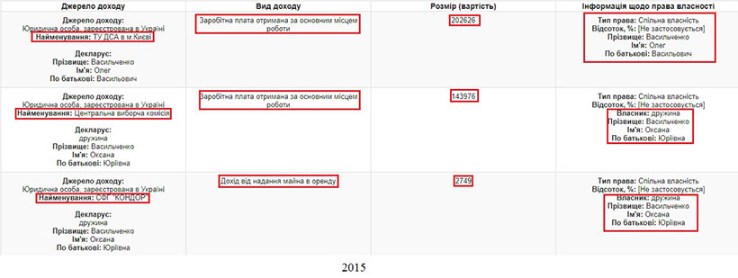 Щодо майнового стану, то проаналізувавши декларації судді за 2014, 2015 та 2016 роки, ми бачимо, що основним доходом родини Васильченків є заробітна плата. Зауважимо, що дружина Олега Васильовича також є держслужбовцем, яка працює у Центральній виборчій комісії, а отже, також має досить скромну заробітну плату та заборону займатися бізнесом.