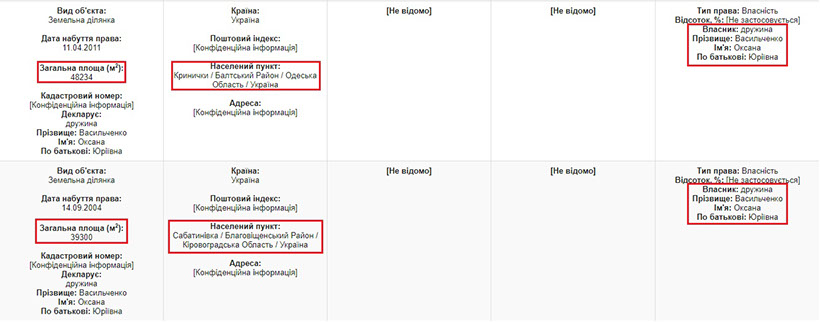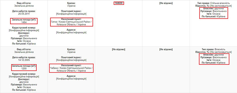 Однак скромні заробітні плати двох держслужбовців не заважають їм мати недешеве майно. Наприклад, дружина судді має у власності: дві земельні ділянки в Київській області загальною площею 26 соток, дві земельні ділянки в Одеській області загальною площею 87 соток та будинок на 258 кв. м. у селі Гатне, поблизу Києва.