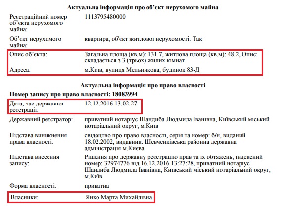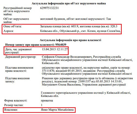 У власності 24-річної невістки прокурора квартира площею 131 кв.м. в центрі Києва по вул. Мельникова, будинок площею 603 кв.м. в елітному селі Козин поблизу Києва та автомобіль Range Rover Evoque 2012 р.в. Все це майно стало власністю Марти Янко в 2015-2016 роках, коли їй було лише 22-23 роки.