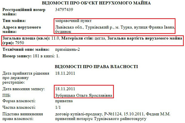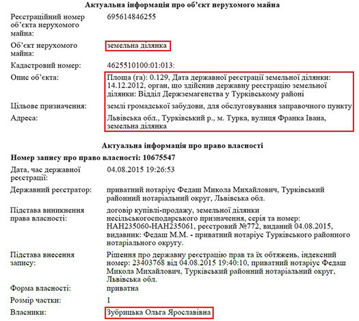 Не менше майна й у дружини прокурора. Зокрема, у її власності земельна ділянка в м. Турка на Львівщині. Цільове призначення цієї ділянки – «Автотехобслуговування», а на ній розміщений заправочний пункт. Це підтверджується і на карті, де вказано, що там розташований «АвтоШик» – вочевидь, місце обслуговування автомобілів. І земля, і наземний комплекс – власність дружини прокурора. От тільки жодних доходів чи від здачі в оренду цього майна, чи від підприємницької діяльності пані Ольга не декларує. Окрім цього, даний заправочний пункт був відсутній у декларації прокурора за 2013 рік, хоча дружина стала власником цього майна ще у 2011 році.