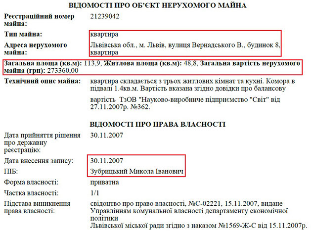 Ще одну квартиру Микола Зубрицький має у Львові. ЇЇ площа – 113 кв. м. і, ймовірно, вона також була службовою, однак, Микола Іванович отримав право власності на неї у 2007 році. У цьому ж будинку прокурор обзавівся гаражем.