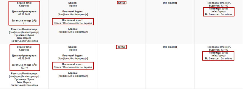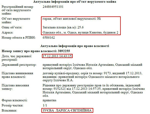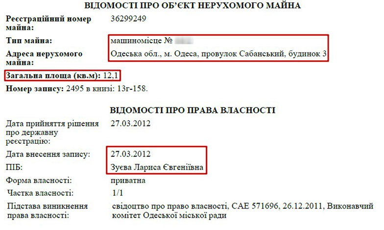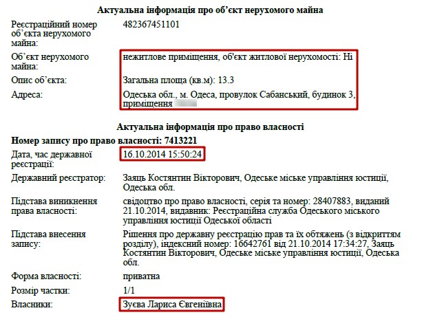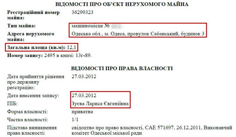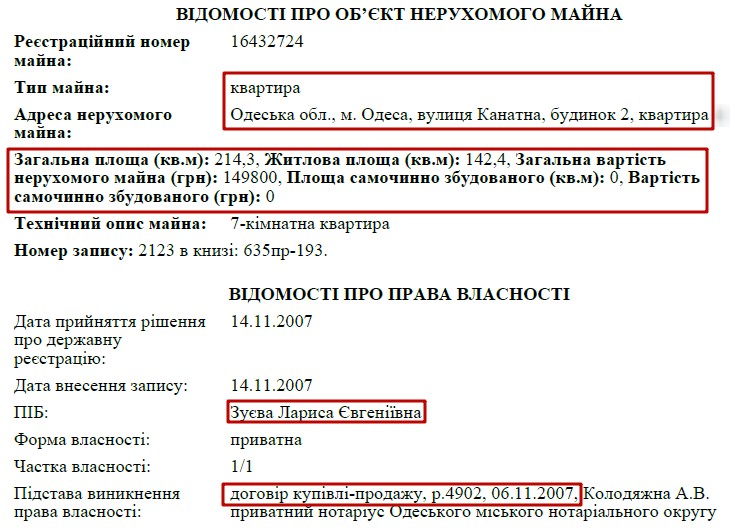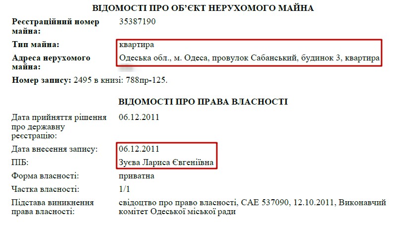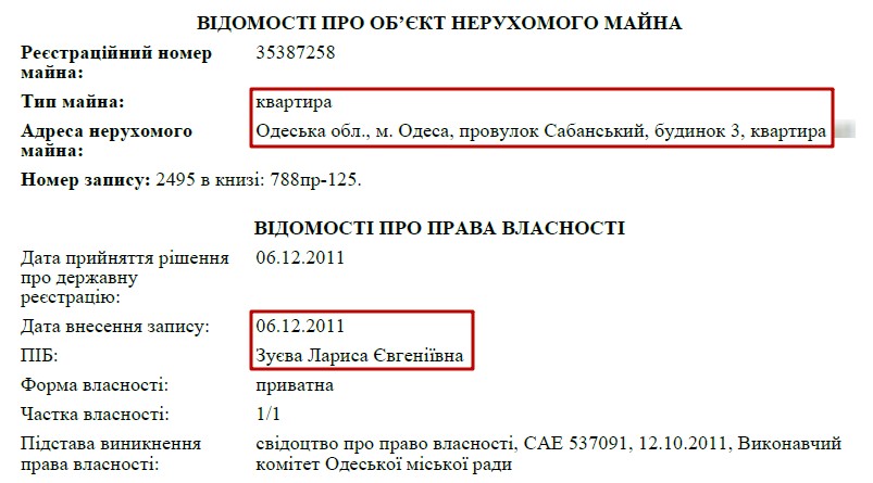 На жаль, ідентифікувати розташування частини нерухомості Зуєвої ми не змогли, адже воно відсутнє в реєстрі речових прав на нерухоме майно. Зокрема мова йде про житловий будинок на 438 кв. м. у селі Таїрове, що неподалік Одеси і там же 1000 кв. м. землі.
